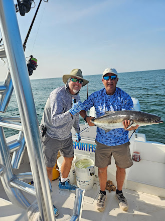 We've been fishing with Capt. Kenny for 9 years and never got skunked. If he's not catching, no one is. It was getting late, and Kenny decided to move closer to the shoreline. About 4:20 in the afternoon, not long before we would be heading in, he spotted a bait ball of Menhaden and blind-casted a live Croaker under the bait. Within seconds the line went tight, and the fight was on. The fish came in at 39 inches, one inch shy of the limit. But we at least kept the streak going.
